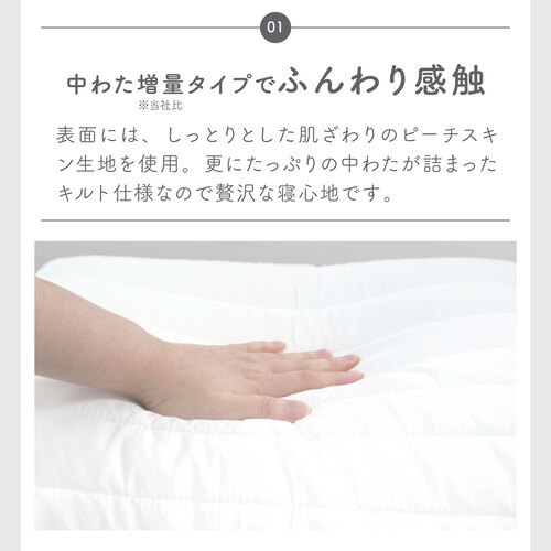 ●表面には、しっとりとした肌ざわりのピーチスキン生地を使用。更にたっぷりの中わたが詰まったキルト仕様なので贅沢な寝心地。