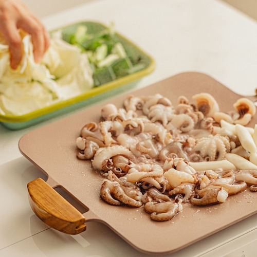 端にちょっと調味料を置いたり、焦げ防止によけて保温させるなどスクエアデザインならではの便利さがもりだくさん。