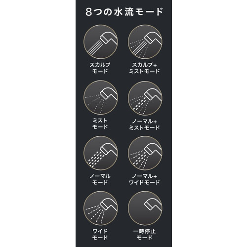 水流切り替えは8段階搭載しています。ノーマルモードに加え頭皮をマッサージするスカルプモードや肌に優しいミストモード、一時停止モードなど使用シーンに合わせた水流切り替えが可能です。