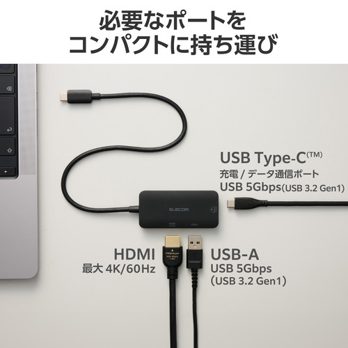 ●ノートパソコンへ給電しながらHDMI(R)映像出力ができる、3ポート搭載のUSB Type-C(TM)接続ドッキングステーションです。必要最小限の機能でコンパクトなサイズながら、取り回ししやすいゆったり30cmケーブルで、抜群の使いやすさを実現。高解像度での映像出力も可能です。
