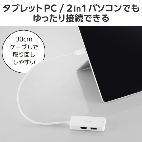 ●ケーブルは紛失の心配がない直付けタイプです。タブレットPC/2in1パソコンでもゆったり接続できるケーブル長約30cmです。