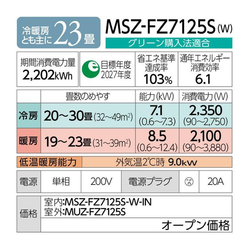 三菱電機 MSZ-FZ7125S ルームエアコン 霧ヶ峰FZシリーズ (23畳用) ピュアホワイト
