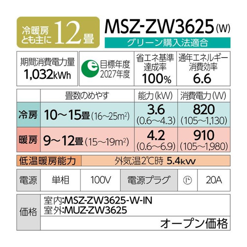 三菱電機 MSZ-ZW3625-W ルームエアコン 霧ヶ峰ZWシリーズ (12畳用) ピュアホワイト