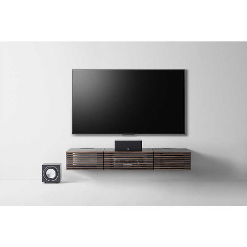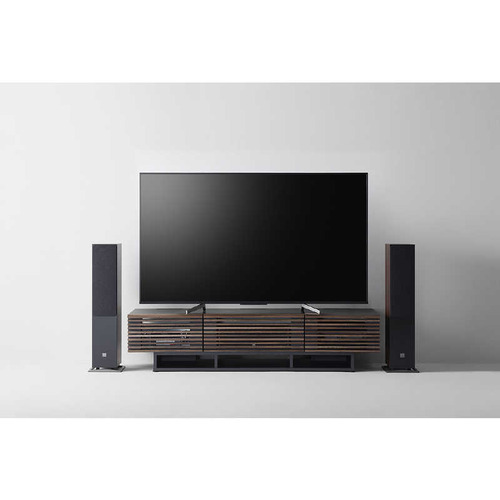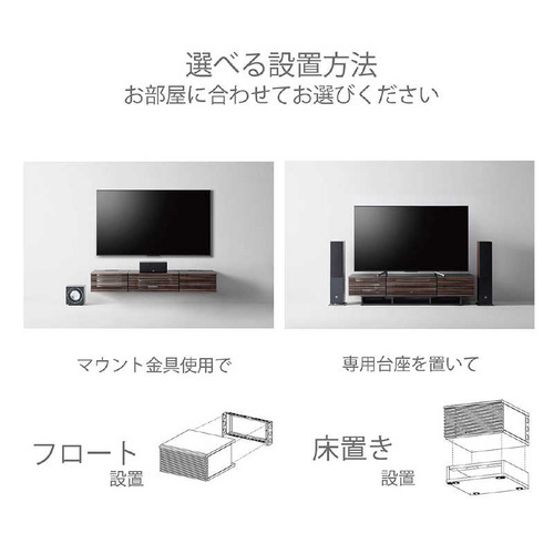 スタンダードな置型の他、壁掛け金具を連結させて壁面へのフローティング設置も可能。ラックユニットには、配線孔を設け、配線をスッキリまとめることができる設計です。センタースピーカーやAVアンプが収まる十分な収納力も備えています。ウォルナット調の格子スタイルが印象的なフラップドアはスタリッシュでどんなインテリアにも調和します。意匠性を求めるだけでなく、収納した機器の放熱対策にも配慮しています。