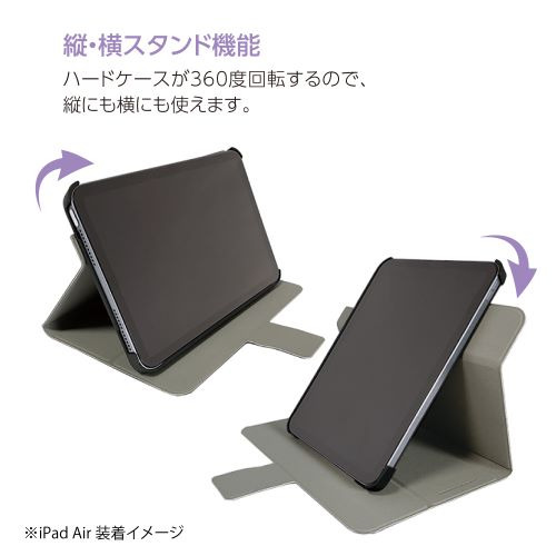 回転式ハードケースがついたiPad専用カバー。縦・横スタンド機能付きでシーンに合わせた自分好みのスタイルで使用できます。