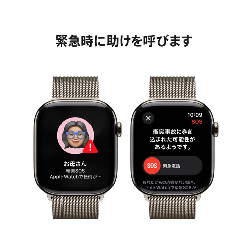 転倒検出と衝突事故検出は、転倒した時や自動車で重大な衝突事故に遭った時、緊急通報サービスに知らせます。すぐに助けを呼びたい時は、ボタンを押して緊急 SOS を発信。到着確認は、あなたが目的地に到着したことを、大切な人に自動で知らせる機能です。