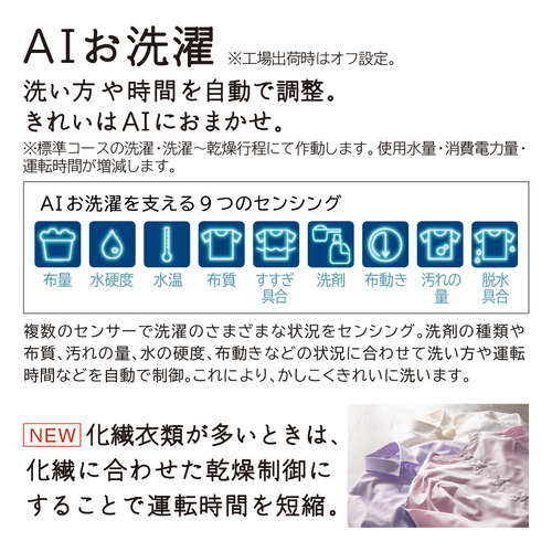 ●洗い方や時間を自動で調整、化繊衣類が多いときは、化繊に合わせた乾燥制御にすることで運転時間を短縮「AIお洗濯」(※)※使用水量・消費電力量・運転時間が増減します。