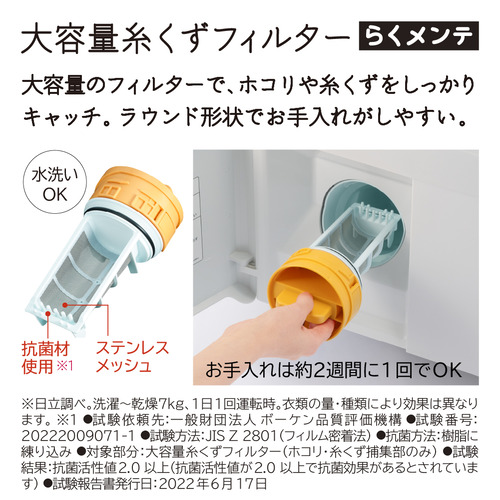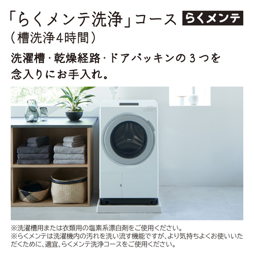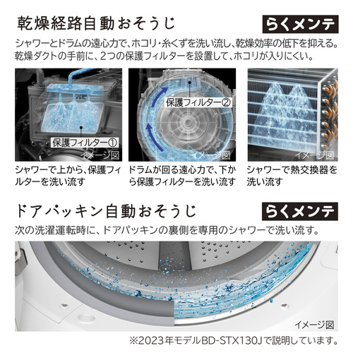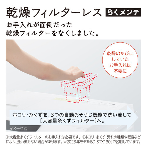 お手入れが面倒だった乾燥フィルターのお手入れは不要になりました。乾燥時のホコリや糸くずは、次の洗濯運転時に、3つの自動おそうじ機能で洗い流して、[大容量糸くずフィルター]で捕集。お手入れがしやすいラウンド形状で、お手入れの頻度は約2週間に1回でOK(※1)。また、洗濯槽・乾燥経路・ドアパッキンの3つを念入りにお手入れする「らくメンテ洗浄コース」も搭載しています(※2)。※1 当社調べ。洗濯から乾燥7kg、1日1回運転時。衣類の量・種類により効果が異なります。※2 洗濯槽用または衣類用の塩素系漂白剤をご使用ください。