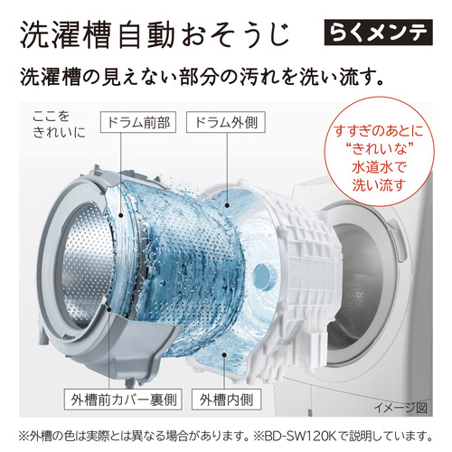 お手入れが面倒だった乾燥フィルターのお手入れは不要になりました。乾燥時のホコリや糸くずは、次の洗濯運転時に、3つの自動おそうじ機能で洗い流して、[大容量糸くずフィルター]で捕集。お手入れがしやすいラウンド形状で、お手入れの頻度は約2週間に1回でOK(※1)。また、洗濯槽・乾燥経路・ドアパッキンの3つを念入りにお手入れする「らくメンテ洗浄コース」も搭載しています(※2)。※1 当社調べ。洗濯から乾燥6kg、1日1回運転時。衣類の量・種類により効果が異なります。※2 洗濯槽用または衣類用の塩素系漂白剤をご使用ください。