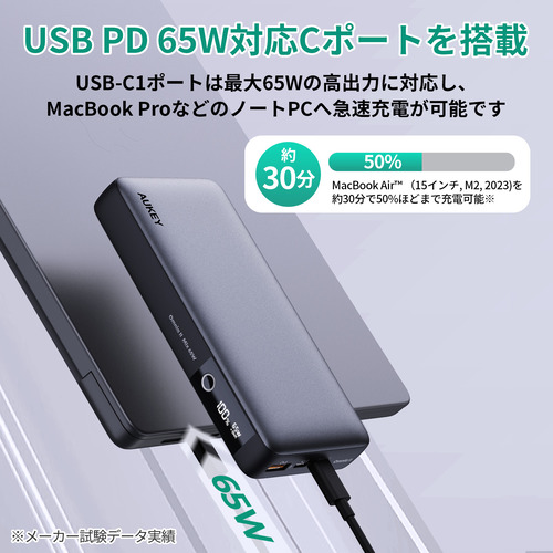 USB-Cポートから最大65Wの出力に対応しており、ノートPCの急速充電も可能です。