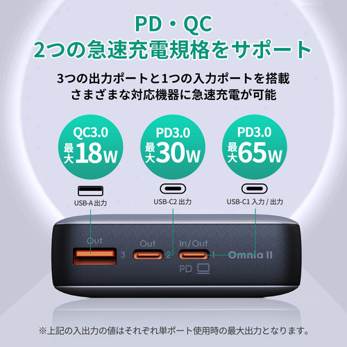 出力:USB-C1: 5V 3A / 9V 3A / 12V 3A / 15V 3A / 20V 3.25A (65W Max); PPS: 3.3-11V 5A USB-C2: 5V 3A / 9V 3A / 12V 2.5A (30W); PPS: 3.3-11V 3A USB-A: 5V 3A / 9V 2A / 12V 1.5A (18W) USB-C1+USB-C2/USB-A: 45W+20W / 18W USB-C1+(USB-C2+USB-A): 45W+15W