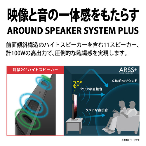 画面上下のスピーカーの音を前方に放出する「ARSS+」(AROUND SPEAKER SYSTEM PLUS)を採用。さらに、クリアでパワフルな音を実現する「パワーボイススピーカー」を搭載し、計100Wの高出力を実現しました。加えて、ハイトスピーカーを保護する金属製パンチングネットの開口率を上げ、よりクリアで広がり感のある音を響かせます。映像と音声の一体感を生み出し、包み込まれるような音響空間を体感できます。