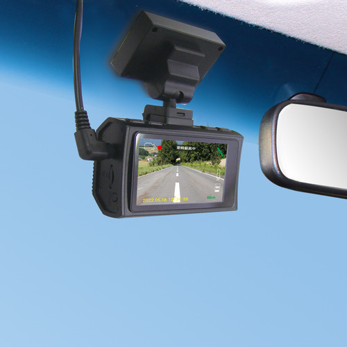 こちらのモデルは取付ステーと一体になったGPSユニットを搭載しています。日時補正を自動で行うほか、速度超過警報(60、80、100、120km/h・OFF設定可能)、車線逸脱警報、車間距離警報の機能が使用できます。更に、専用ビューアーで詳細な情報を確認する事が出来ます。