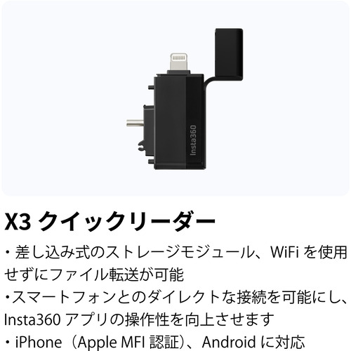 ・差し込み式の単体ストレージモジュール、WiFiを使用せずにファイル転送が可能です・スマートフォンとのダイレクトな接続を可能にし、Insta360アプリの操作性を大幅に向上させます・iPhone(Apple MFI認証)、Androidに対応※対象製品:X3