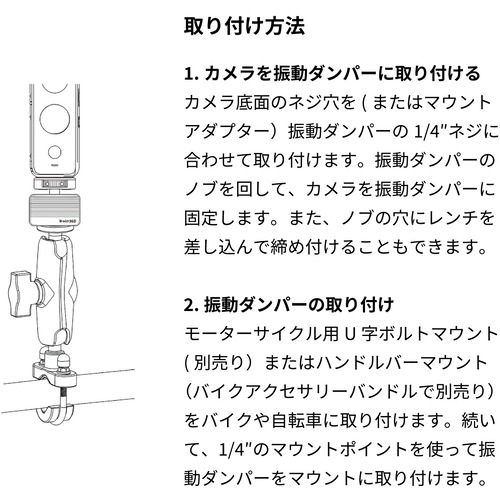 1.カメラを振動ダンパーに取り付けるカメラ底面のネジ穴を (またはマウントアダプター)振動ダンパーの1/4″ネジに合わせて取り付けます。振動ダンパーのノブを回して、カメラを振動ダンパーに固定します。また、ノブの穴にレンチを差し込んで締め付けることもできます。 2.振動ダンパーの取り付けモーターサイクル用U字ボルトマウント(別売り)またはハンドルバーマウント(バイクアクセサリーバンドルで別売り)をバイクや自転車に取り付けます。続いて、1/4″のマウントポイントを使って振動ダンパーをマウントに取り付けます。