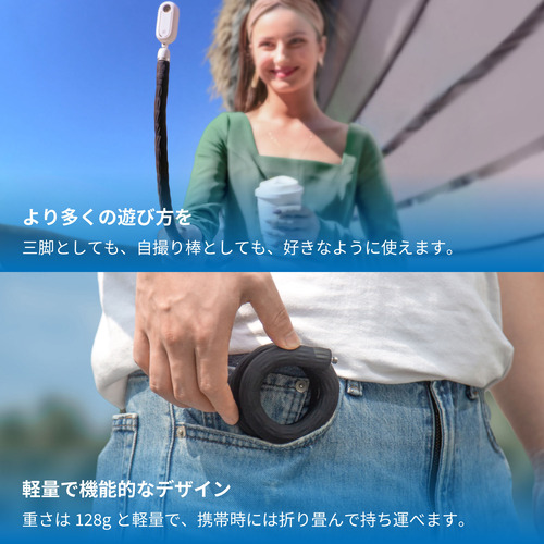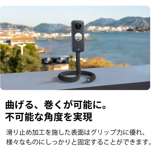 ・好きなように曲げて、いろいろなものに巻いてみましょう。・片手で握って自撮り棒としても使用可能。・軽量で携帯性に優れ、折りたたんで収納することができます。・好きな形を作ることができるので、取り付けの可能性は無限大です。・GO 2 は、磁気スクリューマウントアダプターと一緒に使用する必要があります。※対象製品:X3、ONE RS(1インチ360度版は除く)
