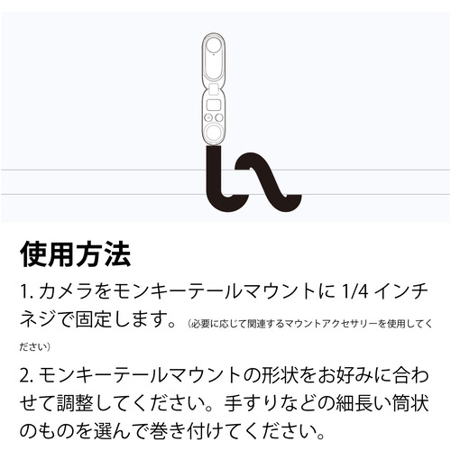 1.カメラをモンキーテールマウントに1/4インチネジで固定します。(必要に応じて関連するマウントアクセサリーを使用してください) 2.モンキーテールマウントの形状をお好みに合わせて調整してください。手すりなどの細長い筒状のものを選んで巻き付けてください。