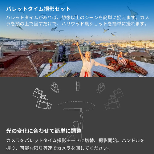 バレットタイムがあれば、想像以上のシーンを簡単に捉えます。カメラを頭の上で回すだけで、ハリウッド風ショットを簡単に撮れます。