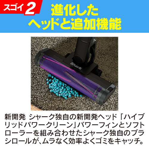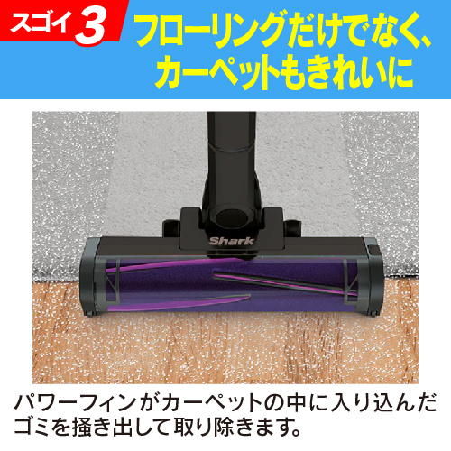 パワーフィンとソフトローラーを組み合わせたシャーク独自のブラシロールが、ムラなく効率よくゴミをキャッチ。