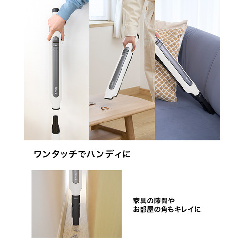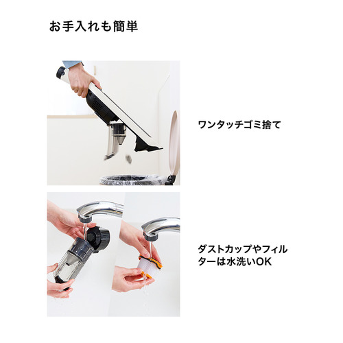 片手でリリースボタンをつまむだけで強力なハンディに。家具上や狭い場所のお掃除も、気づいた時にサッと取ってサッと使えます。ボタンを押すだけでゴミ捨てが簡単。ゴミも飛び散りづらく、手を汚すことなく衛生的です。