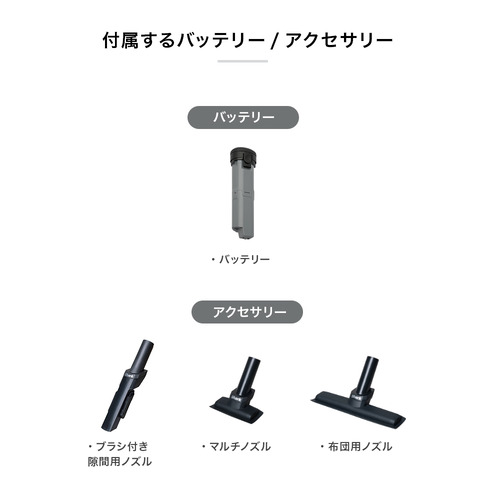 同梱アクセサリー:ブラシ付き隙間用ノズル/マルチノズル/布団ノズル/自動ゴミ収集ドック(充電機能付き)/リチウムイオンバッテリー 1個