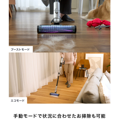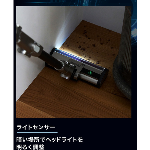 ライトセンサーが暗い部屋ではヘッドライトを自動的に明るく調整し、ゴミやホコリを見えやすくします。