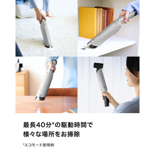 最大40分の駆動時間で、家中さまざまな場所を充電切れの心配をすることなく、満足いくまでお掃除が可能。ハンディだから部屋間の移動もラクラクできます。※エコモード使用時