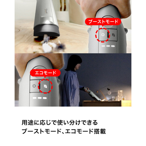 より吸引力のあるブーストモード、より作動音の少ないエコモードを搭載し、シーンにあわせた使い分けで用途が広がります。
