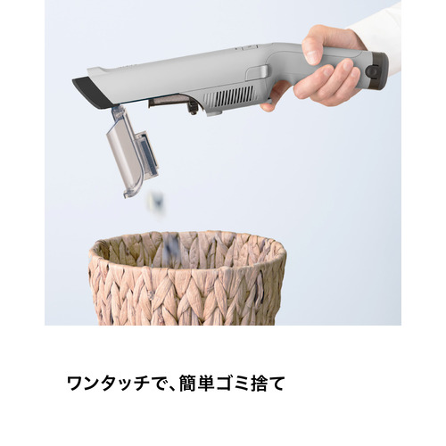 ダストカップのゴミ捨てはワンタッチで完了。ボタンを押すだけで、手に触れることなくゴミ捨てできるので衛生的です。