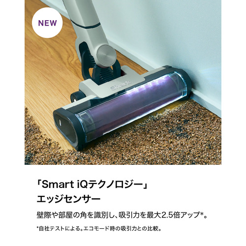 エッジセンサーが壁際を検知して吸引力を自動で最大2.5倍アップ*させることで、徹底的に取り残しを防ぎます。*自社テストによる。エコモード時の吸引力との比較。