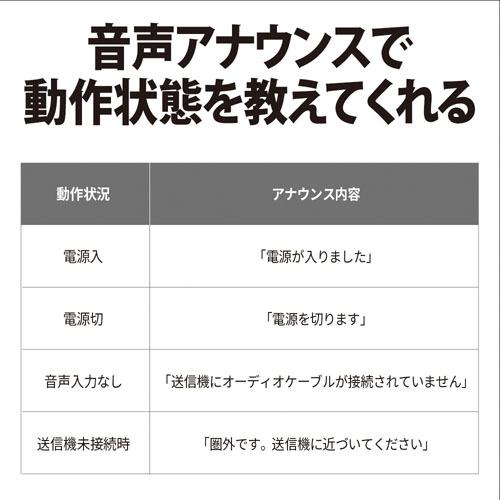 同梱物:ACアダプター(スピーカーユニット部用)、ACアダプター(送信機用)、オーディオケーブル(3極Φ3.5mm)(1.5m)、取扱説明書