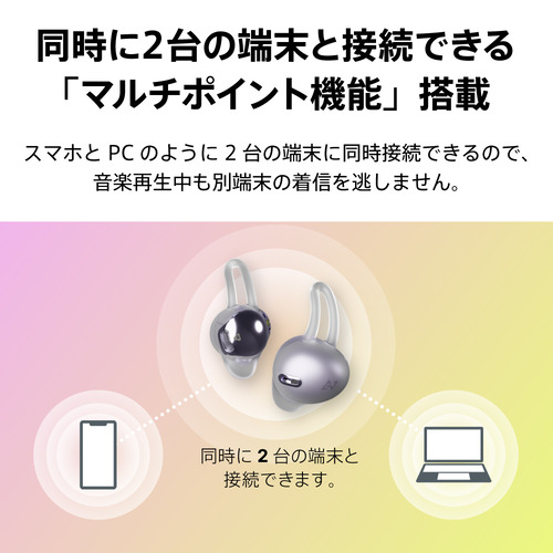 スマホとPC、2台のスマホ等、同時に2台の端末と接続できるマルチポイント機能を搭載。一台を音楽再生用、もう一台を電話待受用にすることもできるので、音楽再生中も別端末にかかってきた着信を逃すことはありません。