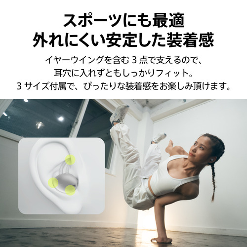 3サイズのイヤーウィングも付属しているので、自分にピッタリなサイズで音楽をお楽しみいただけます。