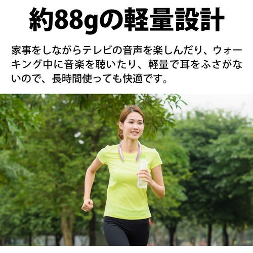88gの軽量設計と長時間連続再生(16時間)。ペアリング済み送信機同梱、テレビとの接続も簡単。SHARP製補聴器の音声調整技術を活用した「クリアボイスプラス」機能により、人の声がよりくっきりと聴こえる。