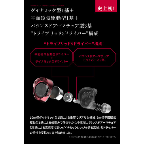 ドライバー形式:トライブリッド5ドライバー(10mmダイナミックドライバー+平面磁気駆動型ドライバー+3BA)