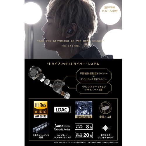 ピエール中野氏コラボモデル“TE-ZX1-PNK(ピヤホン7)」では、ピヤホンの特徴である低音の質感にこだわったサウンドチューニングを施しました。