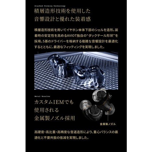 AVIOTのフラッグシップモデル、Zシリーズに相応しい装着感と音響設計を両立するため、前モデルに引き続き、カスタムIEM(イン・イヤー・モニター)に多用され、義肢のような精密で複雑な形状を要求される製品にも使用される積層造形技術を用いてイヤホン本体下部のシェルを造形。