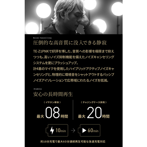 前モデル「TE-Z1PNK」で好評を博した、音質への影響を極限まで抑え、ノイズキャンセリング特有の圧迫感や閉塞感をなくしつつも、高いノイズ抑制機能を備えたノイズキャンセリングシステムを更にブラッシュアップ。