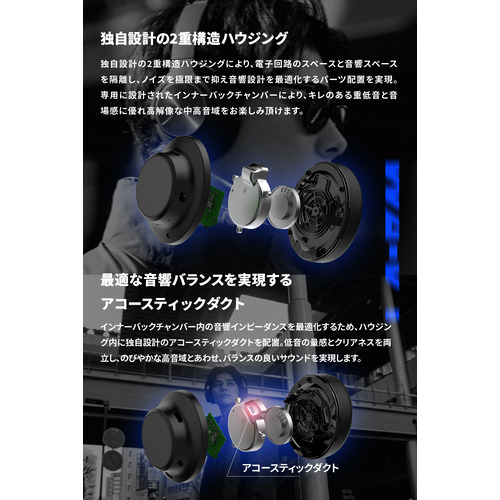 高音質と機能性を両立させるため、ドライバーを収容するハウジングをアウターシェルとインナーバックチャンバーとの2重構造で設計。