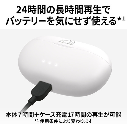 本体のみで約7時間の連続再生と充電ケースでのフル充電(約17時間)により合計約24時間の長時間再生が可能。