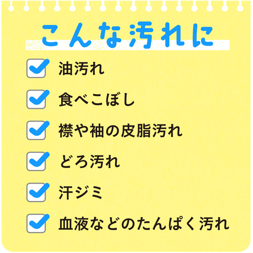 ●5種(皮脂・油、食べこぼし、飲みこぼし、血液、泥)の汚れにこれ1本。