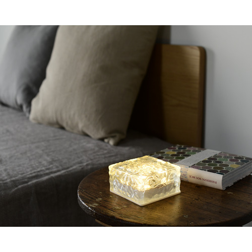 明るい時間はガラスのような見た目でお庭をすっきりと見せ、暗くなると本体上部・側面からやさしい光が広がります。