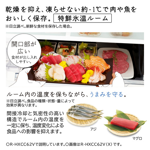 冷蔵室の全段が「まるごとチルド」だからまとめ買いしても置き場所に悩みません。約2℃の低温で食品の菌の繁殖を抑えて鮮度長持ち。また、うるおい冷気でラップなしでも乾燥や変色を抑えておいしく保存できます。(※2)※1 出荷時は「まるごとチルド」設定。設定時は消費電力量が増加。ドアポケットは「まるごとチルド」には含まれません。※2 日立調べ。
