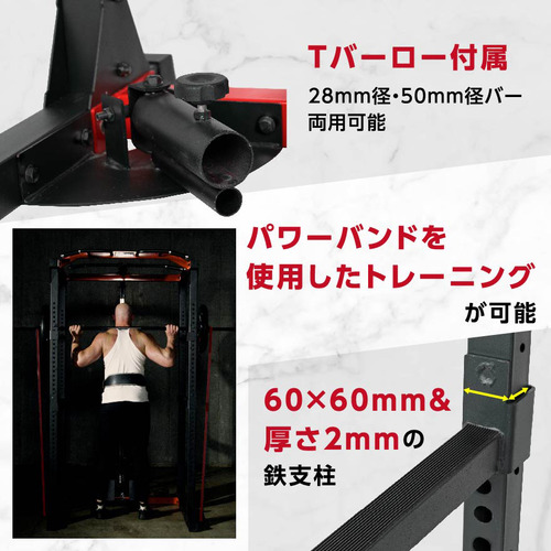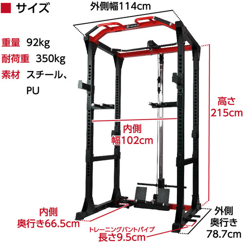 商品サイズ:外側/幅:114cm、奥:78.7cm"(111cm)、内側/幅:102cm 奥:66.5cm(96cm)、高さ215cm、セーフティバー:65cm、手前のスクワットサポート:19cm、後ろのスクワットサポート(短い):9cm