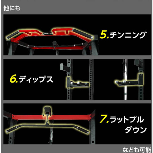 ケーブル軸はローラー式の摩擦軽減設計で、ディップスアタッチメント、マルチチンニングバー付き。グリップサイズを統一することで、集中できるトレーニング環境を実現します。