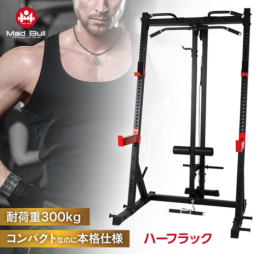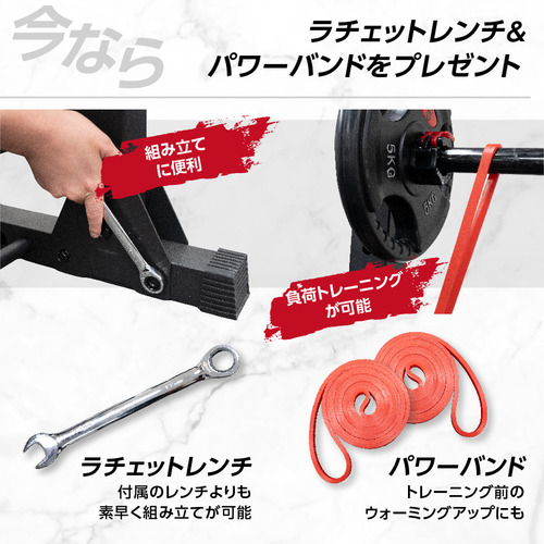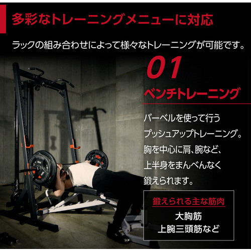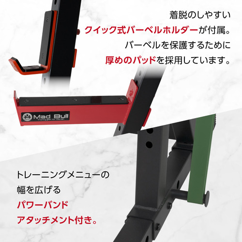 バーベルを損傷から保護するため、厚めのパッドを採用。着脱のしやすいクイック式バーベルホルダー。28mm用プレートが65kgまで収納できるプレートラックなど細部までこだわった本格派です。