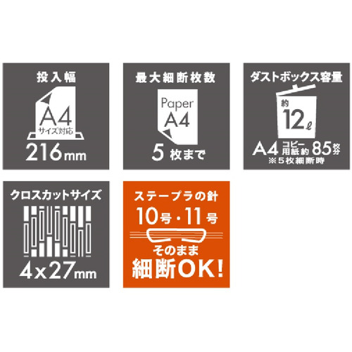 最大細断枚数:5枚(A4上質紙64g/?)