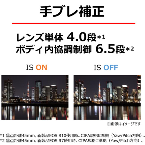 さらに、ボディー内手ブレ補正機構を搭載したEOS RシステムのAPS-Cカメラに装着時は、協調制御により6.5段※2の手ブレ補正効果を発揮します。