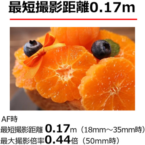 AF時、最短撮影距離は0.17m(18mm〜35mm時)、最大撮影倍率は0.44倍(50mm時)。