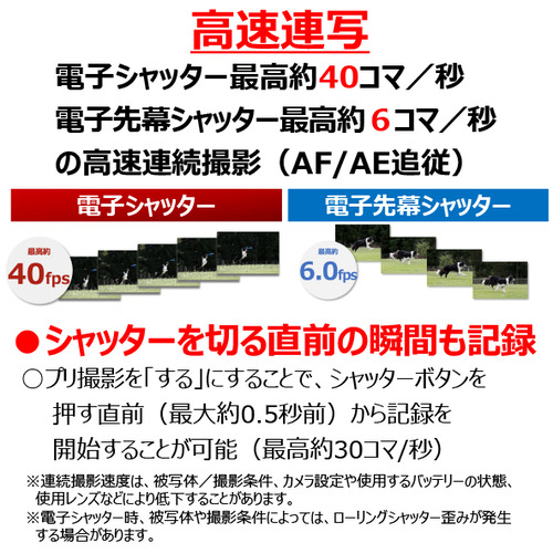 連続撮影速度:■高速連続撮影+:最高約6.0コマ/秒 (電子先幕)、最高約40コマ/秒 (電子シャッター)■高速連続撮影:最高約6.0コマ/秒(電子先幕)、最高約20コマ/秒(電子シャッター)■低速連続撮影:最高約3.0コマ/秒(電子先幕)、最高約5.0コマ/秒(電子シャッター)※ 測定条件、および最高連続撮影速度が遅くなる条件がある※ 対応レンズ装着時